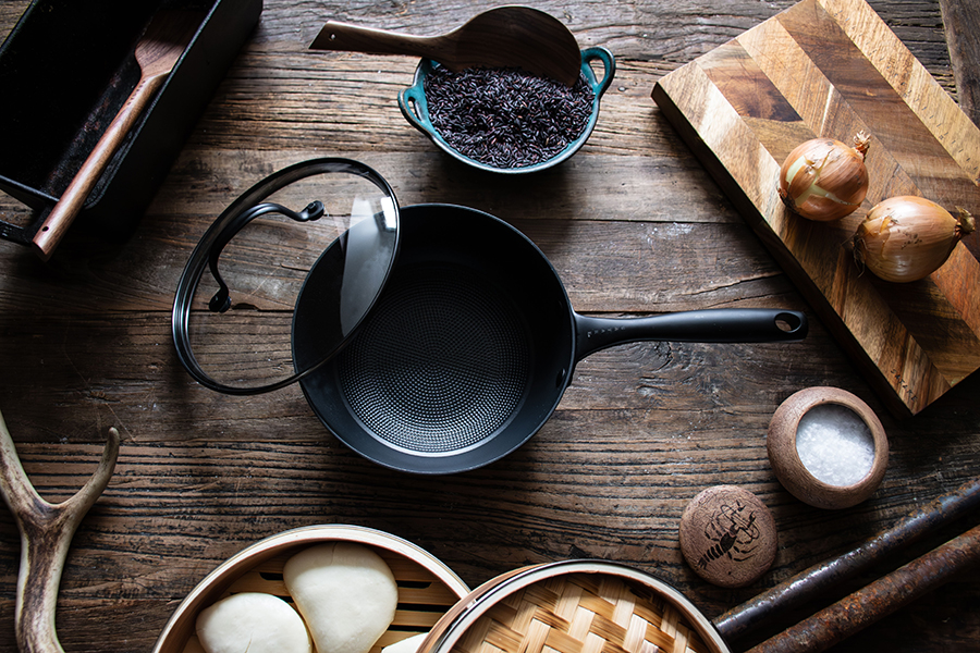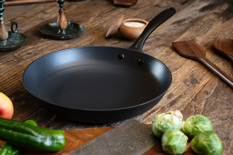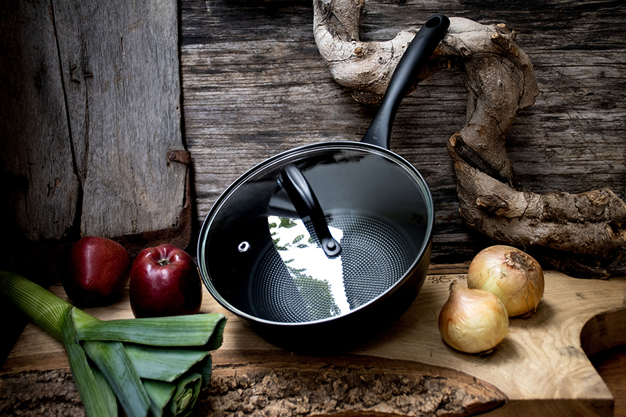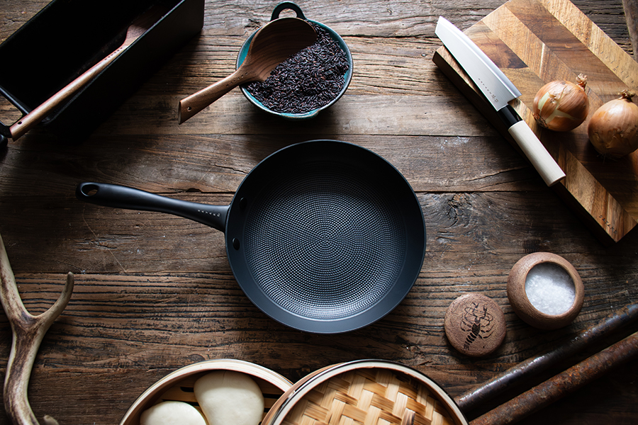 Den andra uppdateringen då? Design och look. Den klassiska stekpannan som ofta ser likadan ut oavsett fabrikat har tagit sig till nästa nivå. Ett mattsvart handtag som är otroligt läckert i både känsla och utseende, med den klassiska Satake-logon debossed undertill. Svarta nitar som håller ihop handtag med stekpanna och såklart den numera klassiska honeycombmönstrade pannan med svart keramisk beläggning. Numera kanske inte bara den bästa stekpannan utan också den snyggaste..?